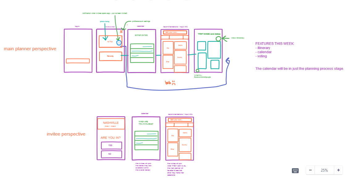 We began our process with an affinity mapping exercise to help us determine emerging patterns for traveling and planning a trip. This helped us to sort our ideas and understand any possible challenges.
